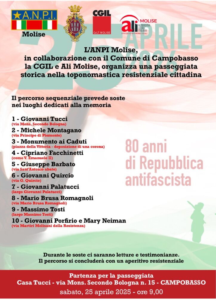 - 25 Aprile Campobasso ore 9.00 PASSEGGIATA STORICA NELLA TOPONOMASTICA RESISTENZIALE (in collaborazione con ANPI, ALI e Comune di Campobasso);