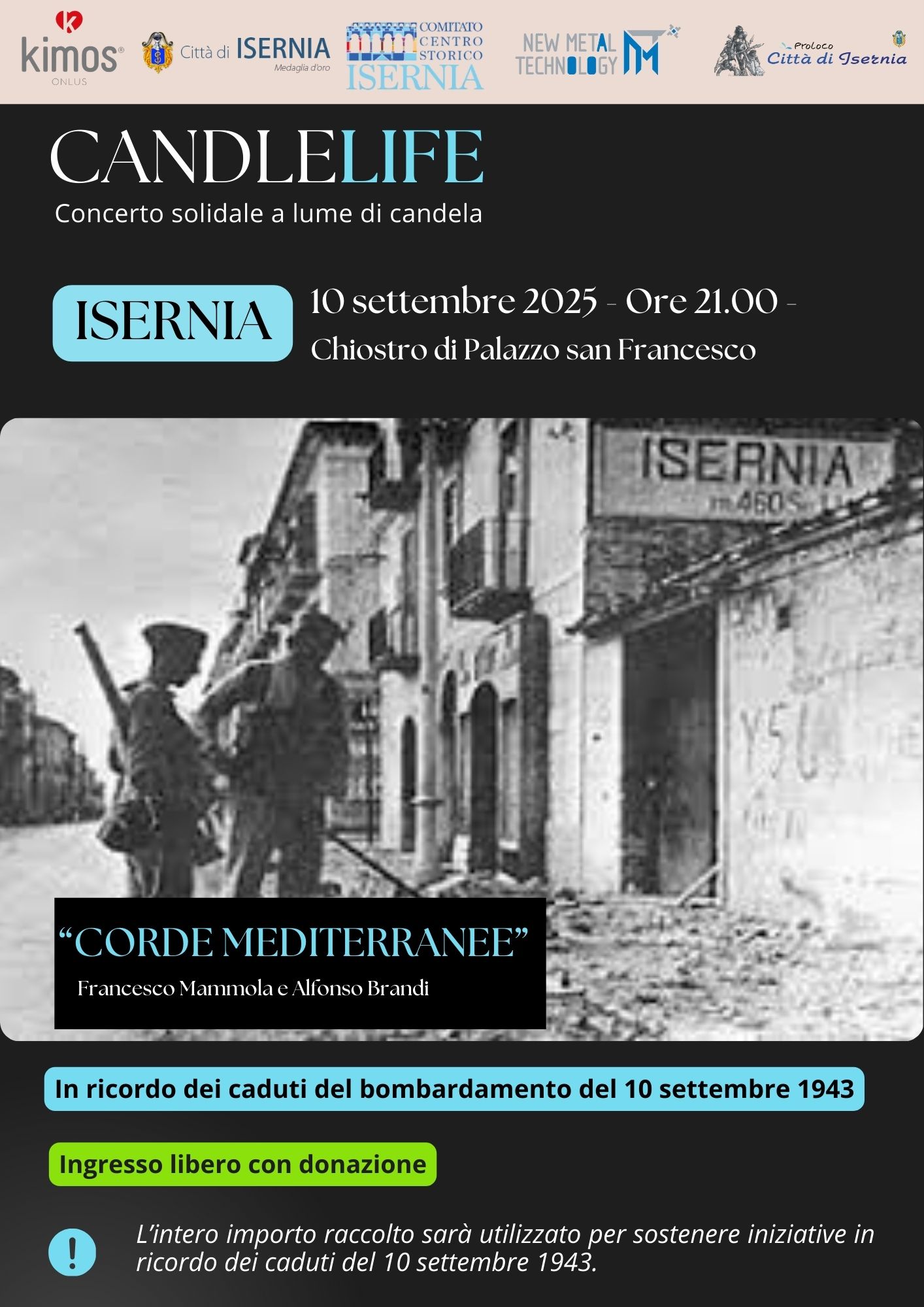 Il 10 settembre 2025 alle ore 21.00 ad Isernia presso il Chiostro di Palazzo San Francesco si terrà “Candlelife Isernia, concerto solidale a lume di candela” organizzato da Kimos Onlus con il patrocinio del Comune di Isernia e in collaborazione con la “Proloco di Isernia” e il “Comitato Centro Storico” in memoria dei caduti del bombardamento del 10 settembre 1943. Il bombardamento di Isernia da parte delle forze aeree anglo-americane, avvenuto il 10 settembre 1943, è stato uno degli eventi più tragici che abbia mai colpito la città di Isernia. Appena due giorni dopo l’annuncio dell’armistizio firmato dal maresciallo Badoglio con gli Alleati, la popolazione isernina accolse con festosi saluti e sventolio di fazzoletti bianchi gli aerei anglo-americani che sorvolavano la città, ignara del triste destino cui sarebbe andata incontro. Ospiti del concerto saranno i Maestri Francesco Mammola e Alfonso Brandi con lo spettacolo “Corde Mediterranee”. La partecipazione al concerto è ad ingresso libero con donazione. La donazione potrà essere effettuata: on-line all’indirizzo https://form.typeform.com/to/Sw2D4K8g o direttamente la sera del concerto all’ingresso del Chiostro di Palazzo San Francesco. L’intero ricavato delle donazioni sarà devoluto al “Comitato Centro Storico di Isernia” per sostenere iniziative organizzate in ricordo di quella terribile giornata. Alcune di queste iniziative saranno presentate dal “Comitato Centro Storico” la sera stessa del concerto.
