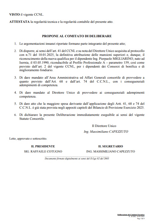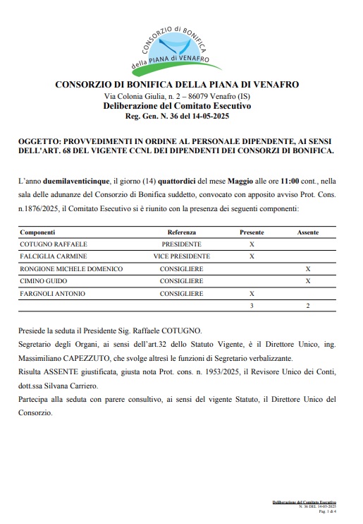 È opportuno sottolineare, tuttavia, come oggi le decisioni oggetto dei nostri dubbi ,non siano state approvate da tutti i componenti dell’esecutivo… diremo, finalmente! Infatti due membri su cinque dell’esecutivo del Consorzio non hanno partecipato al voto. Nella delibera allegata, si evince tale circostanza oltre l’assegnazione di mansioni superiori e della nuova qualifica professionale al figlio di Stefania Passarelli, assunto all’epoca a tempo indeterminato e a chiamata diretta senza evidenza pubblica.( Il Futuro Quotidiano | L’ANAC CONTESTA AL CONSORZIO DI BONIFICA DELLA PIANA DI VENAFRO LA MODALITA’ DELL’ASSUNZIONE DEL FIGLIO DEL CONSIGLIERE REGIONALE PASSARELLI )