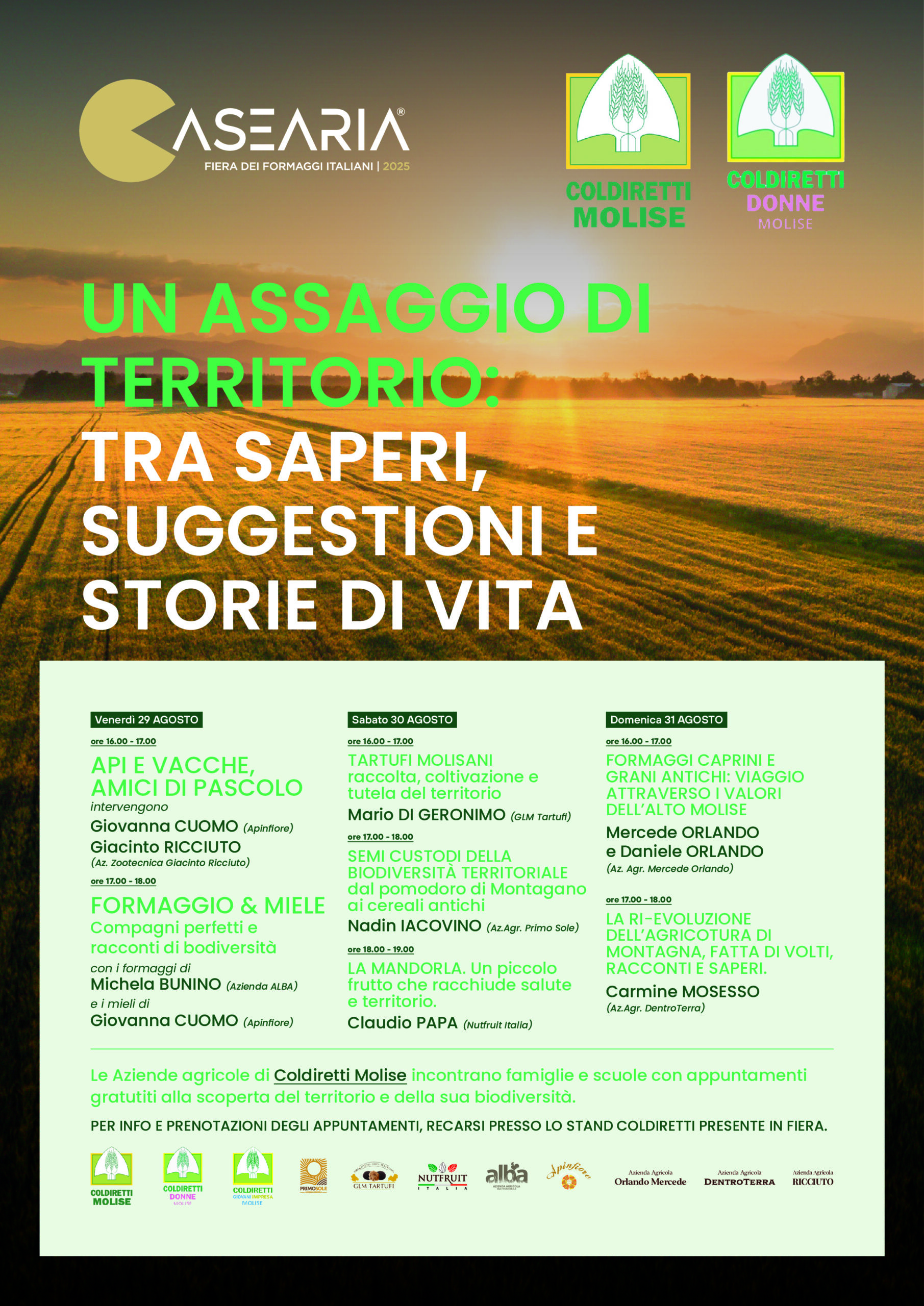 Anche Coldiretti Molise prenderà parte alla terza edizione di Casearia, la fiera italiana dei formaggi, che si terrà ad Agnone (Is) da oggi, venerdì 29 a domenica 31 agosto. La Federazione regionale dell’Organizzazione sarà presente alla manifestazione con uno stand istituzionale ed una specifica area animata da Coldiretti Donne, il movimento delle imprenditrici agricole e zootecniche, in collaborazione con Coldiretti Giovani Impresa, che unisce gli imprenditori e le imprenditrici under 40. All’interno dello spazio dedicato, le imprenditrici ed i giovani di Coldiretti, svolgeranno una serie di eventi, tutti gratuiti, facendo particolare attenzione a famiglie e bambini. Scopo degli incontri, aventi finalità ludico-didattiche, è illustrare alle nuove generazioni e non solo il meraviglioso mondo dell’agricoltura e della zootecnia; un viaggio affascinante nella biodiversità contadina fatta di piante ortaggi e frutti, animali e prodotti genuini, con focus sull’agricoltura di montagna, la coltivazione e la tutela del territorio e la scoperta dei prodotti autentici e genuini della regione. “Api e vacche”, “formaggio e miele” ma anche “tartufi molisani”, “mandorle” e “semi custodi della biodiversità territoriale”, sono solo alcuni degli argomenti che saranno trattati dalle aziende partecipanti alla fiera. “Casearia – ha affermato il presidente regionale di Coldiretti Molise, Claudio Papa – costituisce un momento importante di incontro e confronto sulle peculiarità e le problematiche che riguardano la zootecnia nazionale e regionale che saranno oggetto dei vari incontri che si terranno nel corso della tre giorni. Un’attenzione particolare Coldiretti Molise ha voluto dedicare alle famiglie ed ai più piccoli grazie all’impegno degli appartenenti ai movimenti Donne Impresa e Giovani Impresa, che gestiranno un’apposita area all’interno della quale si animerà il confronto sui vari temi”. “Donne Coldiretti è da sempre in prima linea nell’educazione alimentare delle giovani generazioni – ha spiegato Michela Bunino, Responsabile regionale di Coldiretti Donne – Non potevamo quindi mancare a questo appuntamento così importante per la zootecnia e l’agricoltura molisana più in generale. Invitiamo pertanto tutti a visitare la nostra area dove, nel corso dei tre giorni di apertura della fiera, terremo tanti incontri, tutti gratuiti, che immergeranno i visitatori nella natura, nella cultura contadina e del buon cibo, a cominciare ovviamente dai formaggi, che rendono il nostro Molise unico”.