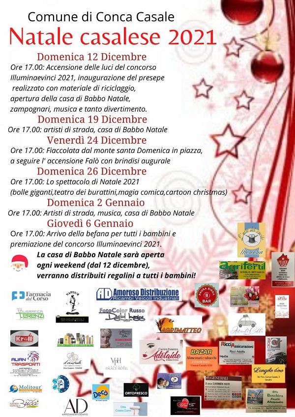 Tutti i Comuni della nostra regione, a prescindere dalla loro grandezza quanto a estensione e popolazione, si stanno attivando per offrire alle collettività locali momenti di sano divertimento e coinvolgimento sociale al fine di festeggiare nel migliore dei modi la nascita del Figlio dell’Uomo e quindi il Natale. Non importa se qualche poco accorta “intelligenza” europea aveva inizialmente deciso di abiurare il termine “Natale” per non far dispiacere qualcuno ! Idea comunque successivamente rientrata, una volta avvedutisi i promotori di tanto dell’assolutamente infelice sortita. Natale perciò bello e vegeto con in testa il suo storico termine e tutti a rimboccarsi le maniche per accoglierlo e festeggiarlo al meglio. Tra i tanti Comuni molisani da segnalare l’impegno per la ridotta comunità di Conca Casale (meno di duecento abitanti !), il cui ente locale ha approntato tutta una serie di appuntamenti come riferisce Martina Bucci, consigliere comunale del posto : “Il Natale Casalese2021 approntato dal Comune di Conca Casale -attacca la giovane amministratrice municipale- si aprirà domenica 12 dicembre per concludersi il 6 gennaio dell’anno nuovo. Il dettaglio degli appuntamenti vede domenica 12 dicembre (h 17) l’accensione delle luci del Concorso Illuminaevinci 2021, l’inaugurazione del presepe realizzato con materiali di riciclaggio,l’apertura della Casa di Babbo Natale, zampognari, musica e tanto divertimento. Si proseguirà il 19, stessa ora, con artisti di strada e Casa di Babbo Natale, mentre il 24 sarà la volta della fiaccolata da Santa Domenica sino alla piazza ed a seguire l’accensione del falò e brindisi augurale. Domenica 26 invece in programma lo spettacolo di Natale 2021, con bolle giganti, teatro dei burattini, magia comica e cartoon Christmas. Il 2 gennaio 2022 sempre dalle h 17 artisti di strada, musica e Casa di Babbo Natale, mentre il 6 gennaio (h 17) è previsto l’arrivo della Befana per tutti i bambini e la premiazione del concorso Illuminaevinci. Infine da dire che la Casa di Babbo Natale a partire dal 12 dicembre sarà aperta tutti i weekend, distribuendo regalini a tutti i bambini”.