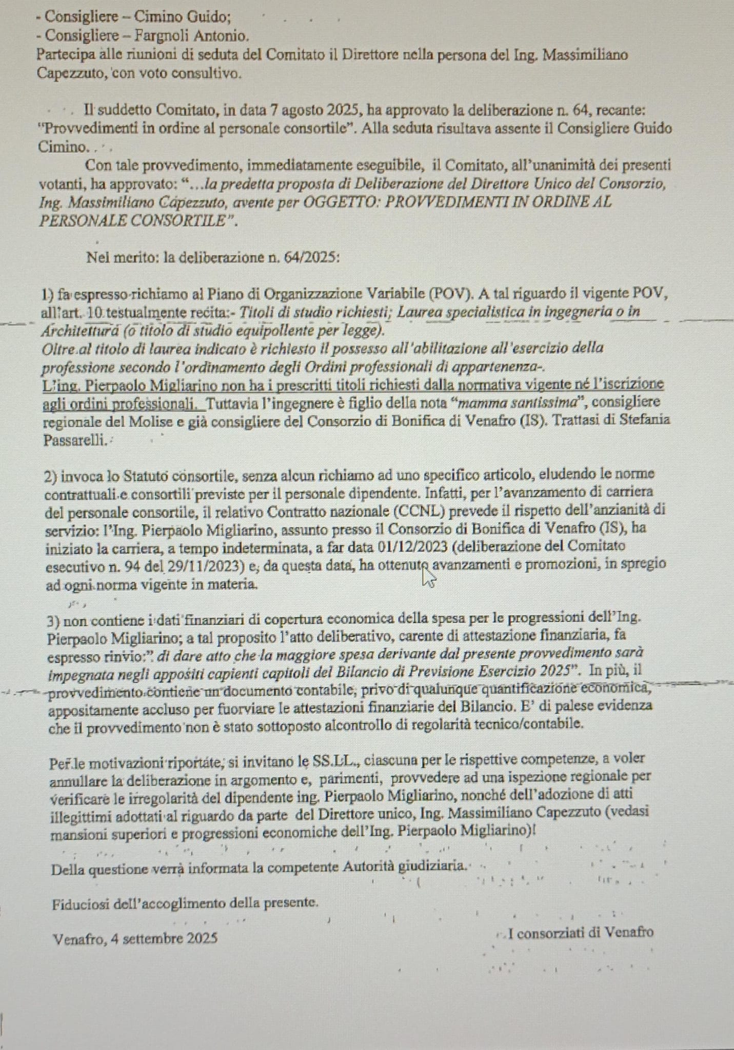 Consorzio di Bonifica di Venafro: I Consorziati sollevano dubbi sulla promozione di un dipendente e annunciano reclamo alla Giustizia