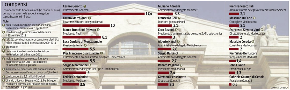 Tornando al 2011, nella classifica seguono a ruota il presidente di Ferrari (gruppo Fiat) Luca Cordero di Montezemolo (5,5 milioni) e Pier Francesco Guarguaglini, che ha lasciato il vertice di Finmeccanica nel dicembre del 2011. Al manager è stata destinata una liquidazione da 4 milioni (il compenso per il periodo non più «lavorato» dalle dimissioni alla fine del mandato, a dicembre 2012) e un milione e mezzo vincolato al patto di non concorrenza fino a fine 2012.