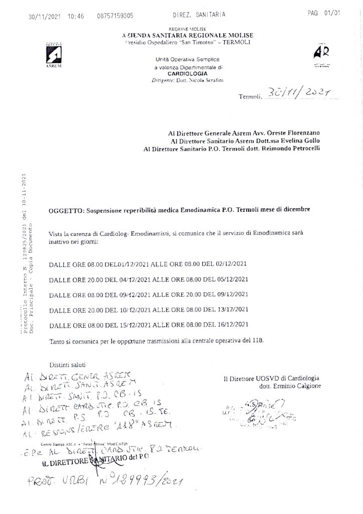 Precisa come un orologio svizzero è arrivata alla fine del mese la nota (che allego) firmata dal dottor Emilio Calgione, direttore dell’unità operativa semplice a valenza dipartimentale del reparto di cardiologia dell’ospedale S.Timoteo, con la quale ha comunicato ai vertici dell’Asrem Florenzano & C. la chiusura di emodinamica in alcuni giorni del mese di dicembre per mancanza di medici.