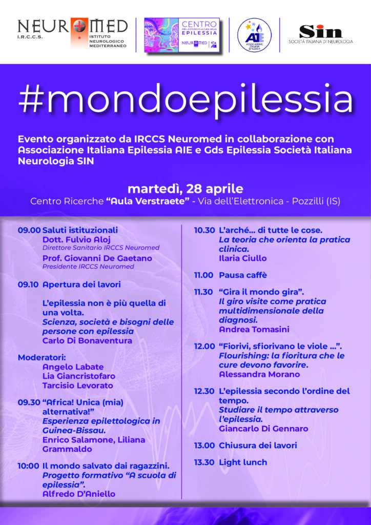 L’I.R.C.C.S. Neuromed organizza, in collaborazione con l’Associazione Italiana Epilessia (AIE) e il Gruppo di studio dedicato della Società Italiana di Neurologia (SIN), un incontro dal titolo ‘#mondoepilessia’ per porre l’attenzione sull’approccio a questa condizione che coniughi biomedicina ed esperienza esistenziale del vivere con la patologia. L’incontro è previsto per martedì, 28 aprile, a partire dalle ore 9.00, presso l’Auditorium ‘Marc Verstraete’ del Parco Tecnologico dell’Istituto di Pozzilli, in via dell’Elettronica, è vedrà un confronto tra addetti ai lavori e rappresentanti dei due Enti coinvolti. Si parlerà di scienza, società e bisogni delle persone con Epilessia, dell’esperienza epilettologica in Guinea-Bissau (Africa), del progetto formativo ‘A scuola di Epilessia’ e delle varie attività promosse dall’Istituto, insieme ad AIE, per informare, formare e divulgare tutti gli aspetti di assistenza e di studio legati a questa condizione. L’incontro vuole dunque proporre, in maniera pratica e costruttiva, un modello clinico innovativo che si propone di diventare parte integrante del sistema di cura: un approccio che non si limita al controllo delle crisi, all’uso di farmaci, ma mira alla piena realizzazione della persona restituendole dignità, nonché una prospettiva di vita migliore grazie al lavoro multidisciplinare e alla condivisione degli obiettivi.