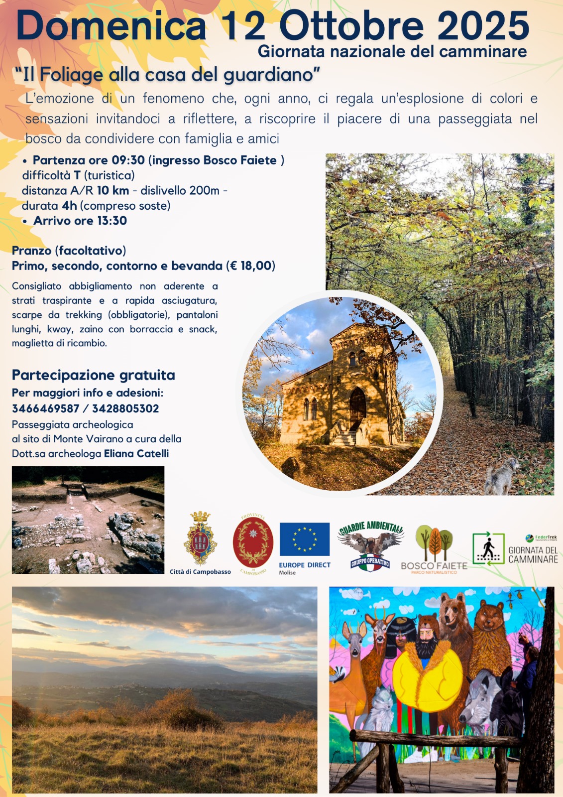 Domenica 12 ottobre, l’Associazione Guardie Ambientali propone l’escursione naturalistica Il foliage alla casa del guardiano. Un trekking archeologico lungo i sentieri di Montevairano fino agli scavi, accompagnati dall’archeologa Eliana Catelli, per scoprire le tracce del passato immerse nei colori autunnali del bosco. Ritrovo alle ore 9.30 presso l’ingresso del Parco Naturalistico Bosco Faiete, rientro previsto alle 13.00. Possibilità di pranzare in loco (facoltativo, con contributo).