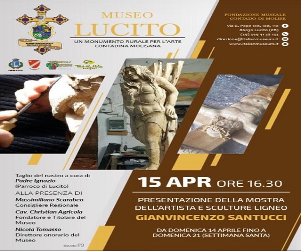 Lunedì 15 aprile, alle ore 16.30, presso il Museo di Lucito, per la prima volta in Molise verrà presentata la mostra dello scultore internazionale Gianvincenzo Santucci: la mostra si terrà dal 14 aprile al 21 aprile 2019 (settimana santa).