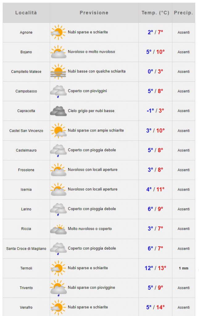 Di seguito le previsioni automatiche per le principali località molisane: