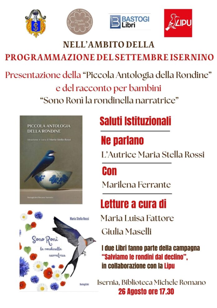 Nell’ambito della programmazione del Settembre isernino, oggi, 26 agosto , alle ore 17:30, presso la Biblioteca “ Michele Romano” di Isernia, si terrà la presentazione della “ Piccola Antologia della rondine “ e del racconto per bambini e “Sono Ronì la rondinella narratrice” dell’autrice Maria Stella Rossi che dialogherà con Marilena Ferrante. Le letture sono a cura di Maria Luisa Fattore e Giulia Maselli. I due libri fanno parte della campagna “ Salviamo le rondini dal declino” in collaborazione con la Lipu.