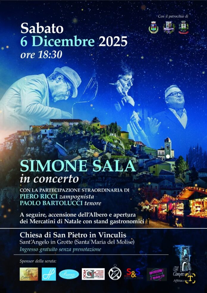 Il piccolo borgo di Sant’Angelo in Grotte, frazione di Santa Maria del Molise, è pronto per vestirsi di luci, profumi e colori per accogliere uno degli eventi più attesi della stagione: il Mercatino di Natale 2025, in programma sabato 6 dicembre prossimo. Anche quest’anno, le vie del borgo si trasformeranno in un grande villaggio natalizio, dove sarà possibile respirare la calda atmosfera delle feste tra artigianato locale, prodotti tipici e delizie gastronomiche. Un’occasione perfetta per trovare regali originali e vivere la magia delle festività in uno scenario suggestivo. L’evento prenderà ufficialmente il via alle ore 18.00 con la cerimonia di accensione dell’albero di Natale, simbolo di un momento di comunità e condivisione. A seguire, alle ore 18.30, presso la chiesa di San Pietro in Vinculis, si terrà il concerto del maestro Simone Sala, con la partecipazione straordinaria del tenore Paolo Bartolucci e dello zampognista Piero Ricci: un trio d’eccezione che regalerà al pubblico un’atmosfera di autentica emozione natalizia.