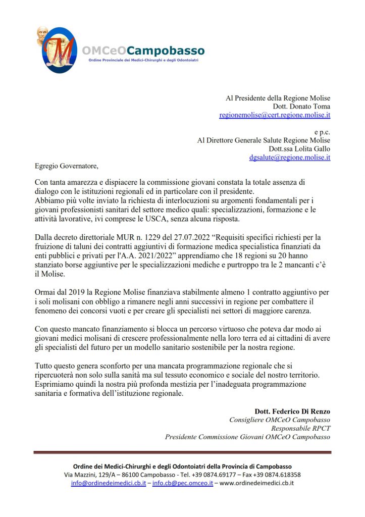 Diciotto Regioni su venti hanno stanziato borse aggiuntive per le specializzazioni mediche e purtroppo tra le due mancanti c’è il Molise. E’ il dato al centro dalla nota inviata oggi dal presidente della Commissione Giovani OMCeO di Campobasso, il dottor Federico Di Renzo, al Governatore del Molise Donato Toma e al direttore generale per la Salute della Regione Molise Lolita Gallo.