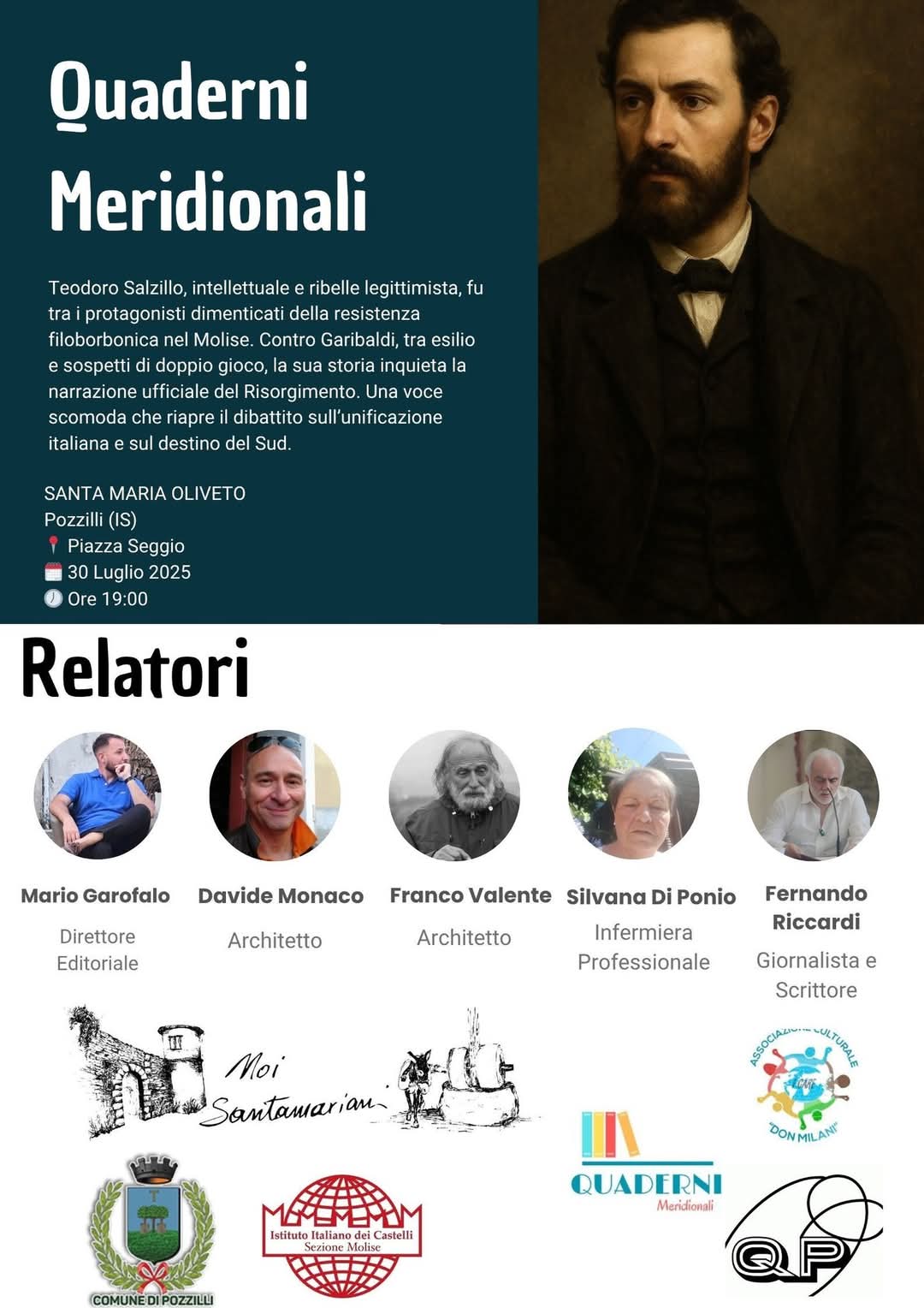 Mercoledì 30 luglio 2025, alle ore 19:00, Quaderni Meridionali apre un nuovo ciclo di incontri nel borgo molisano di Santa Maria Oliveto (Pozzilli, IS), con un evento dal titolo evocativo: “Storie dal Sud che non smettono di parlare — Teodoro Salzillo. Intellettuale e ribelle legittimista”. L’incontro avrà luogo in Piazza Seggio, e sarà aperto e chiuso da Rosanna Franchitti, presidente dell’Associazione culturale Noi Santamasariani, e moderato da Chiara Franchitti, teologa e coordinatrice del comitato di ricerca “Teodoro Salzillo”. Tra gli ospiti che interverrano, le figure di spicco di