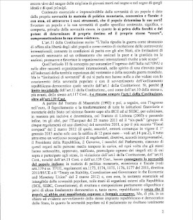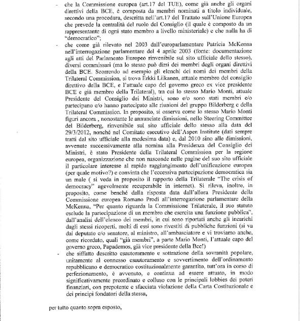 In un estratto della denuncia si legge che il “contenuto essenziale della sovranità di un popolo è dato dalla propria sovranità in materia di politica monetaria, economica e fiscale: è con essa, ed attraverso i suoi strumenti, che un popolo determina le sue sorti. Svuotare un popolo e la sua sovranità di quello specifico contenuto significa, e comporta, privarlo della sovranità stessa, in quanto lo si priva dalla facoltà e dal potere di determinare il proprio destino ed il proprio stesso “essere”, compromettendone la sua stessa esistenza”.