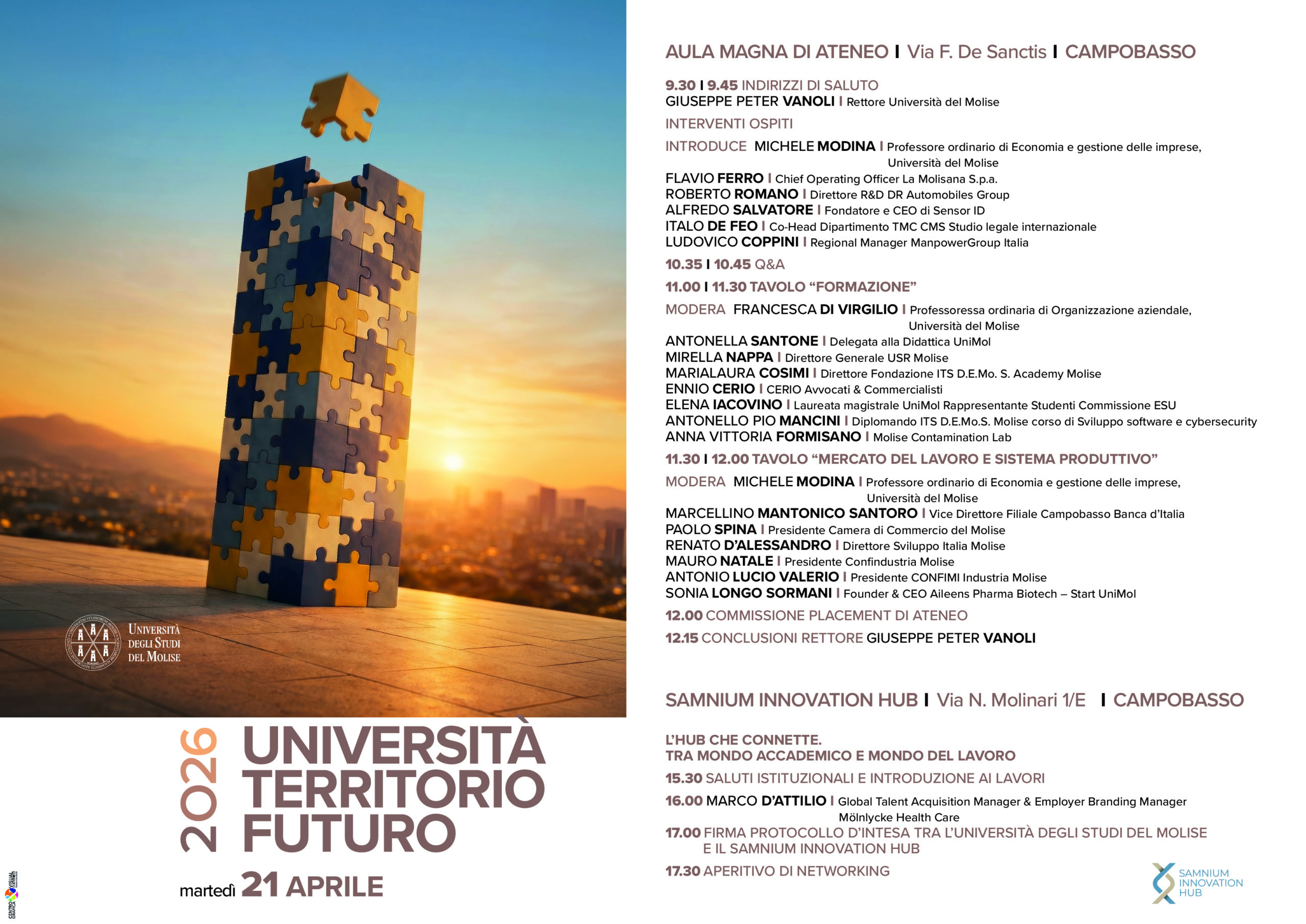Tracciare un percorso comune, ampliare e favorire occasioni di dialogo, reciproca collaborazione e una strutturata interconnessione tra mondo accademico, sistema economico-produttivo, associazioni di categoria e attori istituzionali, rappresenta per l’Università degli Studi del Molise una delle priorità strategiche su cui fondare lo sviluppo del territorio. Da qui l’organizzazione dell’evento Università, Territorio, Futuro, in programma il prossimo 21 aprile, dalle ore 9.30 – alla 13.00, nell’Aula Magna di Ateneo – Campus universitario Vazzieri, via Francesco De Sanctis, Campobasso. L’iniziativa nasce dalla volontà di rafforzare e promuovere un confronto attivo e continuativo sulle prospettive di crescita del territorio e sul ruolo dell’Università nella costruzione di professionalità e opportunità per le nuove generazioni e come collante e motore di conoscenza, innovazione, ricerca e sviluppo. L’evento è pensato in particolare per studentesse e studenti, laureande e laureandi, laureate e laureati, dottorande e dottorandi, ai quali è dedicata un’importante occasione di incontro diretto e di orientamento con il mondo del lavoro e delle professioni, con testimonianze, voci e risposte da parte di rappresentanti di imprese, istituzioni e organizzazioni attive sul territorio, per comprendere da vicino le dinamiche del mercato del lavoro, le competenze oggi richieste. Saranno approfonditi temi centrali quali le trasformazioni in atto nel tessuto produttivo regionale e nazionale, il ruolo dell’innovazione tecnologica e digitale nei processi di sviluppo e competitività, nonché le opportunità di inserimento e crescita professionale per giovani.Il programma della mattinata in Aula prevede: una sessione di presentazione da parte di imprese multinazionali, nazionali e locali, con focus su processi aziendali e innovazione tecnologica; un primo panel con enti e organizzazioni impegnate sui temi dei giovani, della formazione e dello sviluppo locale; un secondo panel dedicato al mercato del lavoro e al sistema economico-produttivo, con la partecipazione di rappresentanti del sistema economico-finanziario, delle imprese e delle associazioni di categoria. L’iniziativa è aperta e rivolta a tutti gli interessati. Nel pomeriggio, a partire dalle ore 15.30, l’evento proseguirà presso il Samnium Innovation Hub, nella zona industriale di Campobasso (via Natale Molinari, 1/E), con il workshop L’Hub che connette. Il Samnium Innovation Hub tra mondo accademico e mondo del lavoro.